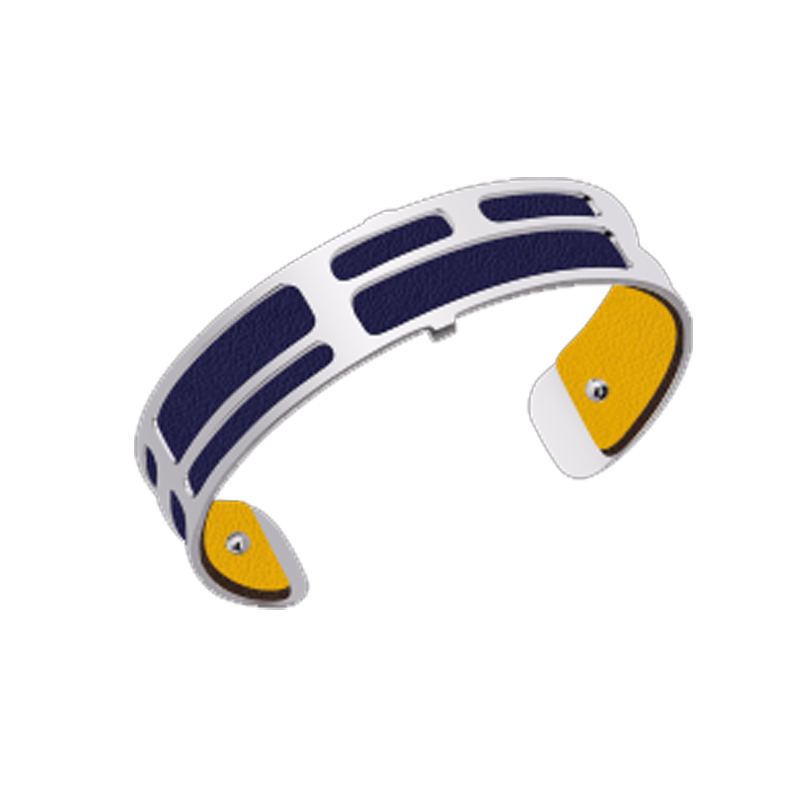 Materiales: Realizado en metal con acabado plateado y cuero reversible de color azul fuerte y amarillo mostaza.