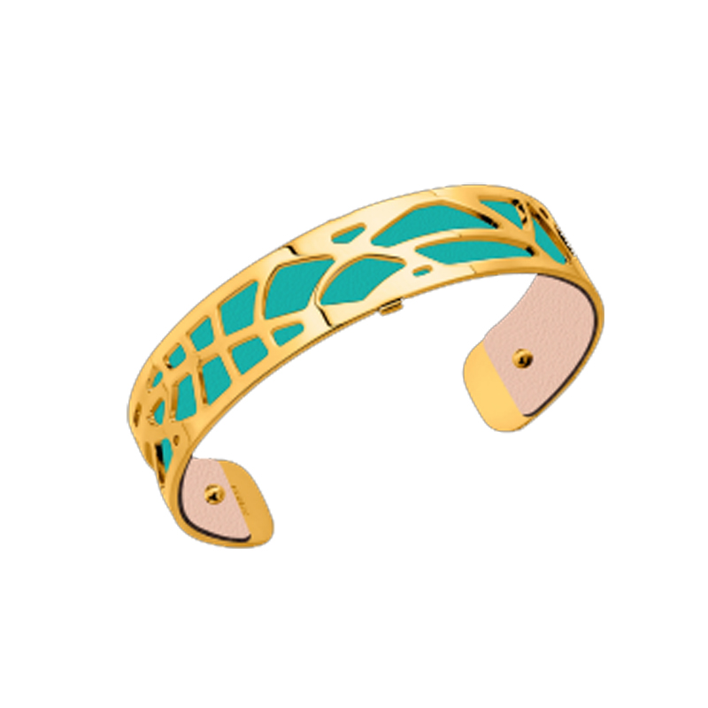 Materiales: Realizado en metal con acabado dorado y cuero reversible de color turquesa y nude.