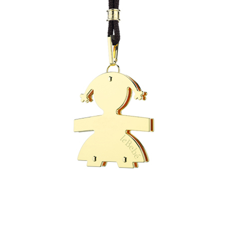 Materiales: Realizado en oro amarillo de nueve quilates, con la silueta de una niña. Puede llevarse con un cordón de nylon (como en la foto) o con una cadena.