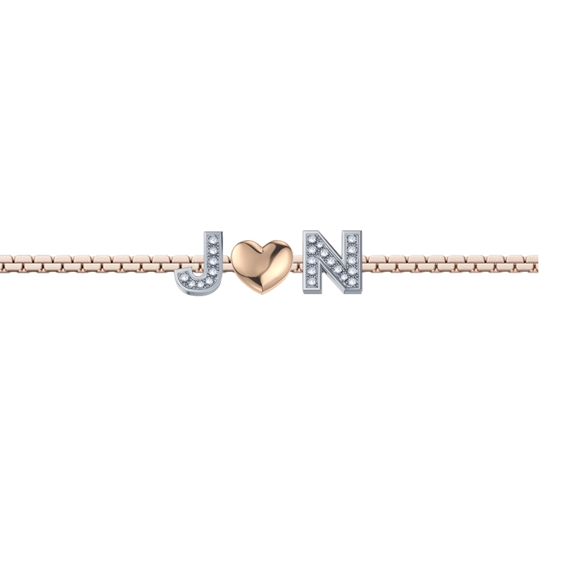 La base de la pulsera está hecha con plata 925 mm. y lleva un baño de oro rosa. Los motivos centrales: las iniciales son de oro blanco 750 mm. con pavé de diamantes, y el corazón es de oro rosa 750 mm.