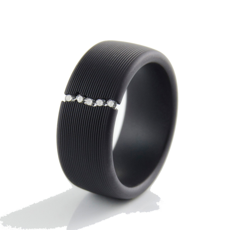 Este anillo está realizado con un acero de un intenso color negro, este color consigue que los 5 diamantes brillen de una forma especial. Los diamantes tienen una talla brillante y un peso de 0,015 quilates, TW-SI.