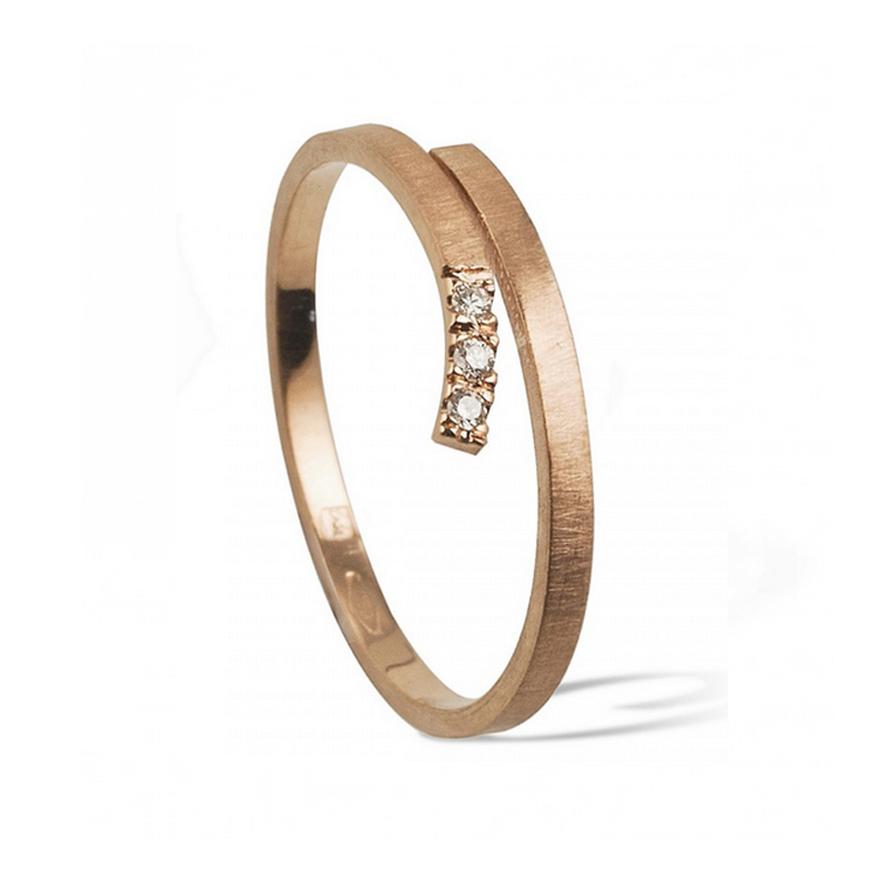 Los materiales: El anillo "Vuelta 1" está hecho con oro rojo de 18 quilates (750mm.), y tres diamantes de 0,021 quilates.