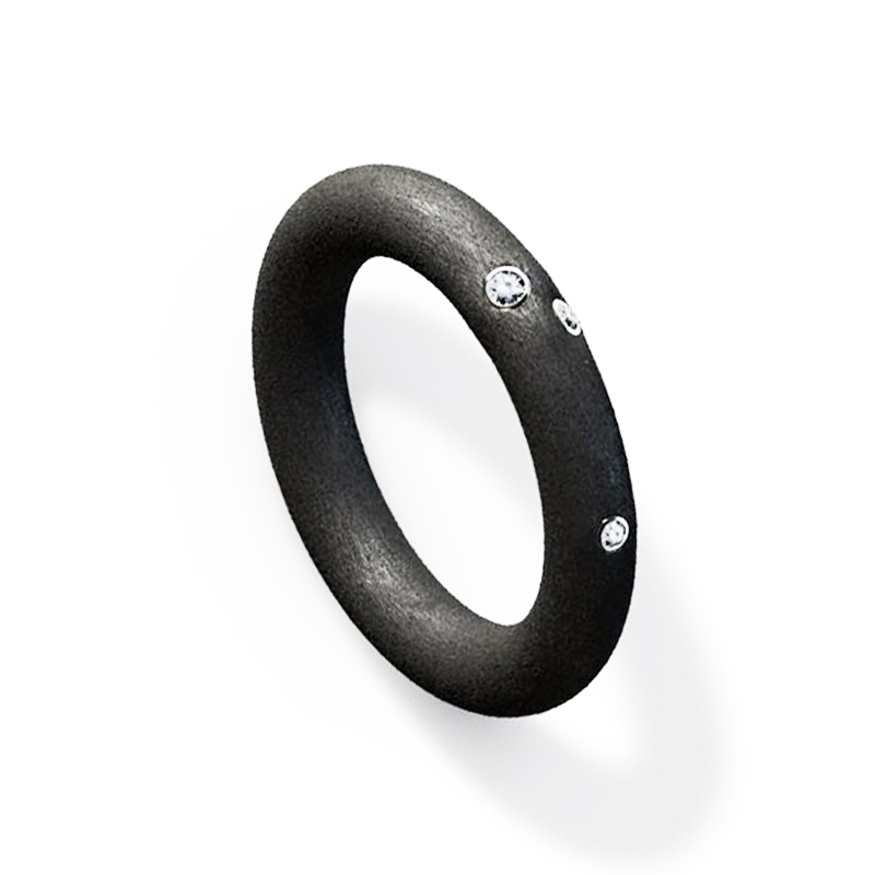 Realizado con caucho, oro blanco de 18 quilates y 3 diamantes con talla brillante W-SI, 0,04 quilates. Sección del aro circular de 4 mm. de diámetro.