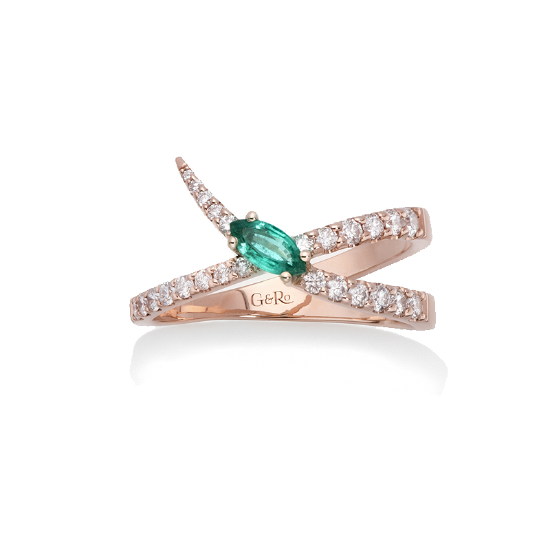 Materiales: Oro rosa de 18 quilates. Diamantes con talla brillante, 0,32 quilates. 1 esmeralda con talla oval, 0,20 quilates.