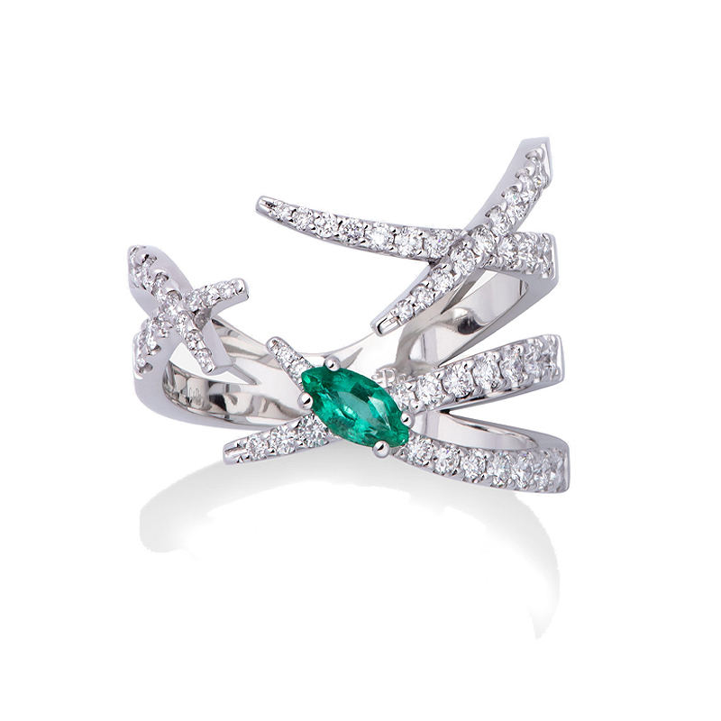 Materiales: Oro blanco de 18 quilates. Diamantes con talla brillante, 0,56 quilates. 1 esmeralda con talla oval, 0,20 quilates.