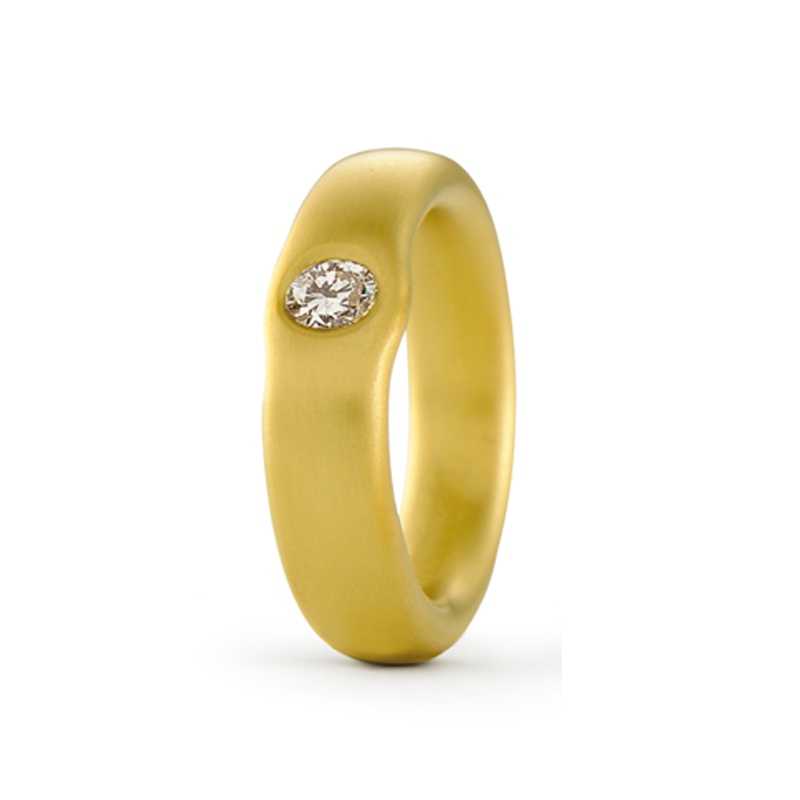Este anillo, llamado "comprimido" por la forma en que el oro sujeta el diamante, pertenece a la colección de anillos de brillantes de Niessing. Se puede realizar en oro de 18 quilates o en platino. El oro se puede trabajar en distintas tonalidades: amarillo, rojo, gris, gris arena o verde (como en la imagen).