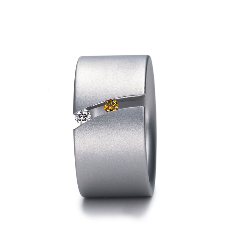 El anillo Runway está realizado en acero, lleva 2 diamantes con talla brillante. Un brillante de 0,06 quilates TW-VS, y un brillante 0,05 quilates Fancy-VS. Es un diseño muy especial: es un anillo con movimiento. Uno de los diamantes permanece fijo, el otro se desplaza a lo largo del canal.