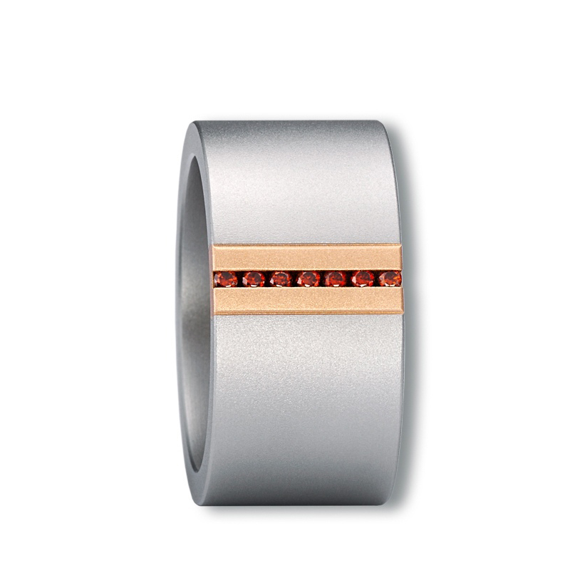 El anillo Steelline está realizado en acero y oro rojo 750mm, 7 diamantes con talla brillante de 0,01 quilates, color red cherry-VS.