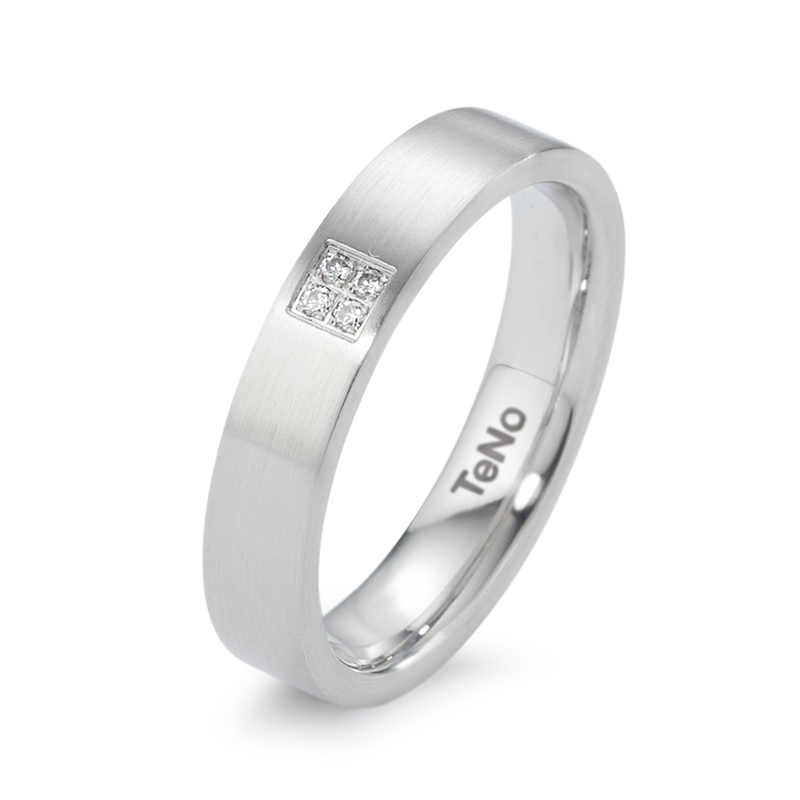 Realizado en acero. Sección del anillo rectangular. En el centro 4 diamantes con talla brillante Top Wesselton -SI, con un tamaño de 0,032 quilates.
