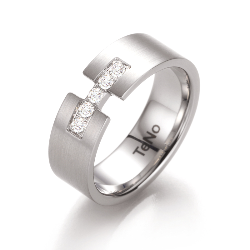 Materiales: Realizado en acero inoxidable, con 5 diamantes en talla brillante (0,20 quilates, TW/SI). Este anillo tiene un perfil rectangular y un acabado matizado.
