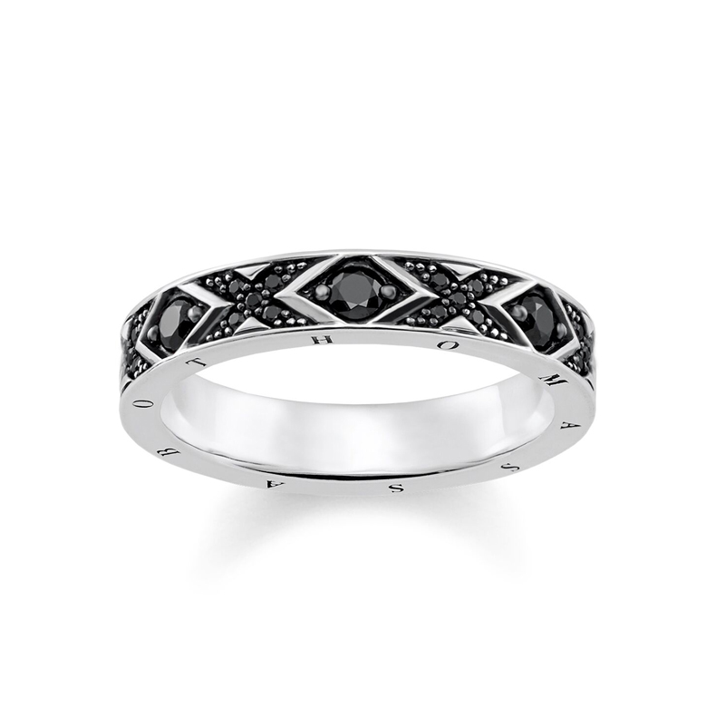 La decoración con circonitas: La utilización de piedras para embellecer las joyas es una constante a lo largo de la historia de la joyería. En este anillo se han utilizado circonitas negras y se han dispuesto en un diseño geométrico, sin principio ni final.