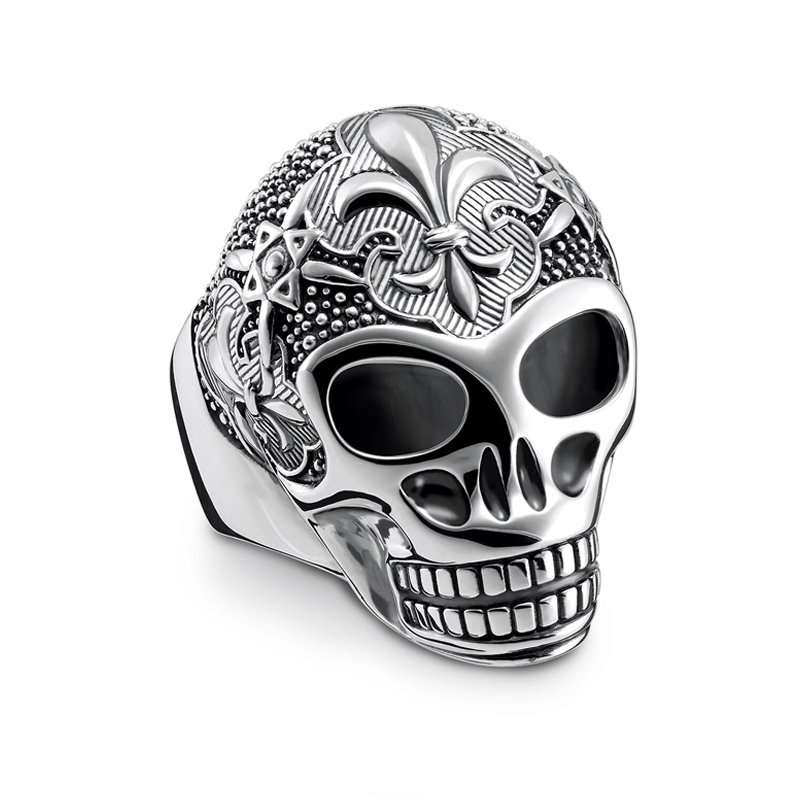 El anillo "Calavera flor de lis" está hecho de plata 925 mm., con un acabado ennegrecido. Incorpora la flor de lis, símbolo de los Borbones y marcados claroscuros. Circonitas negras.