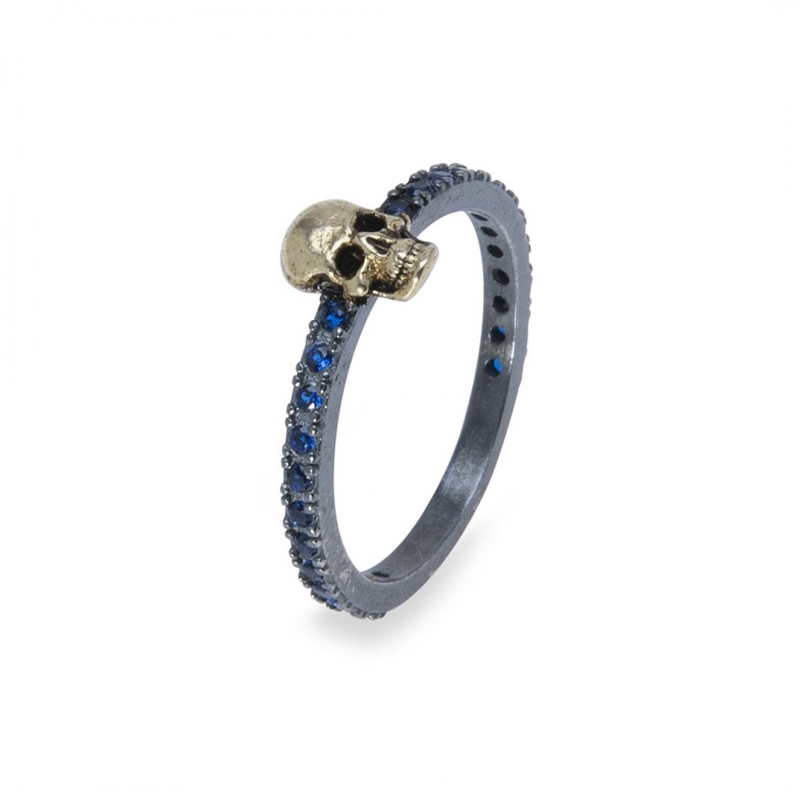 Este anillo está hecho con plata 925 mm., la calavera lleva un chapado de oro y circonitas azules.