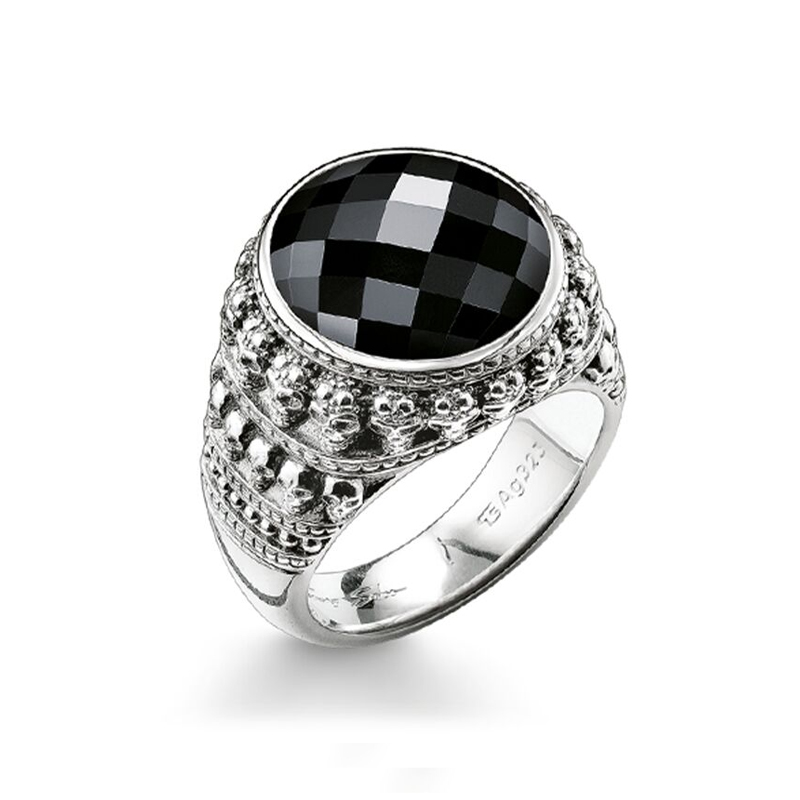 El anillo "Calaveras y ónix" está hecho de plata 925 mm., con un acabado ennegrecido. En el centro lleva un ónix tallado.