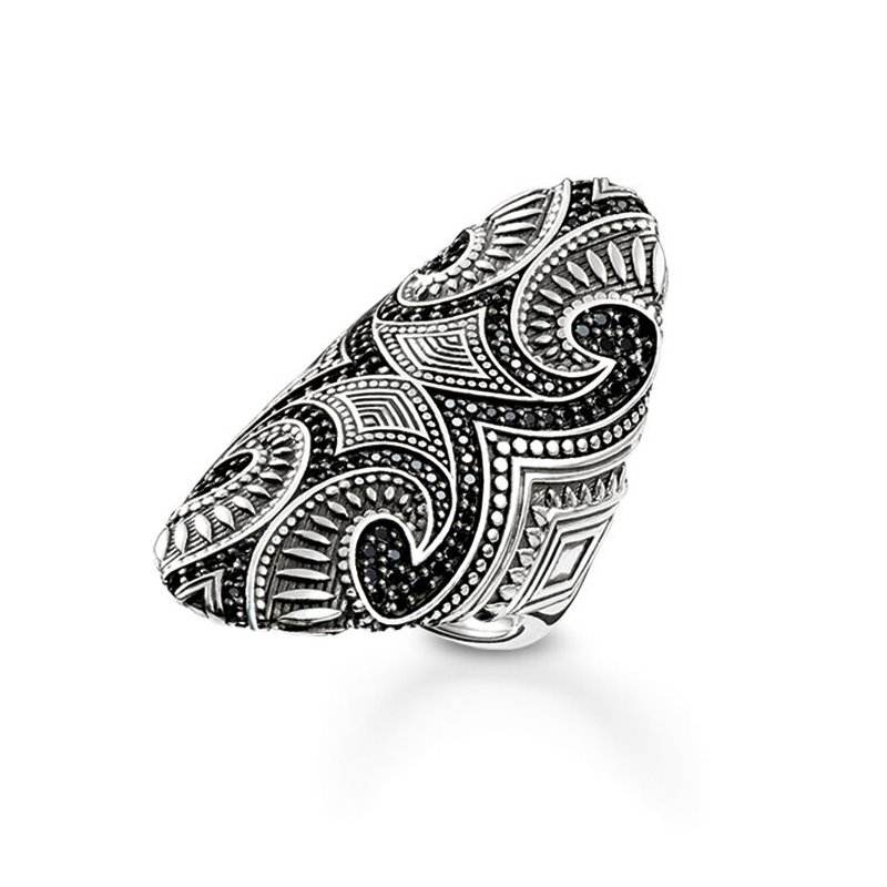 El anillo "Inspiración maorí" está hecho de plata 925 mm., con un acabado ennegrecido y pequeñas circonitas de color negro.
