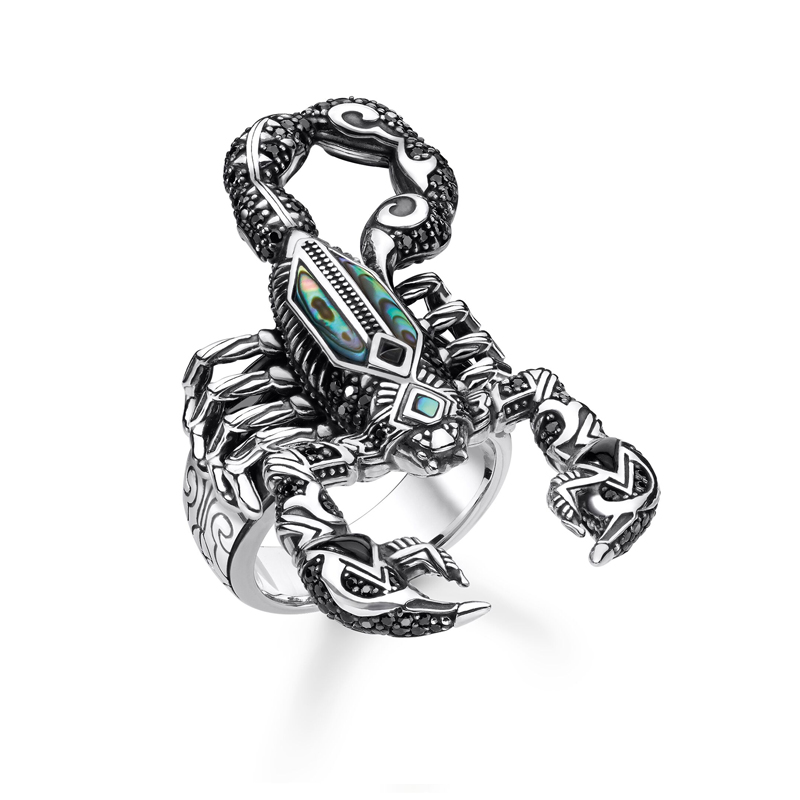 El anillo "Escorpión" está hecho de plata 925 mm., nácar de abulón, circonita negra y ágata.