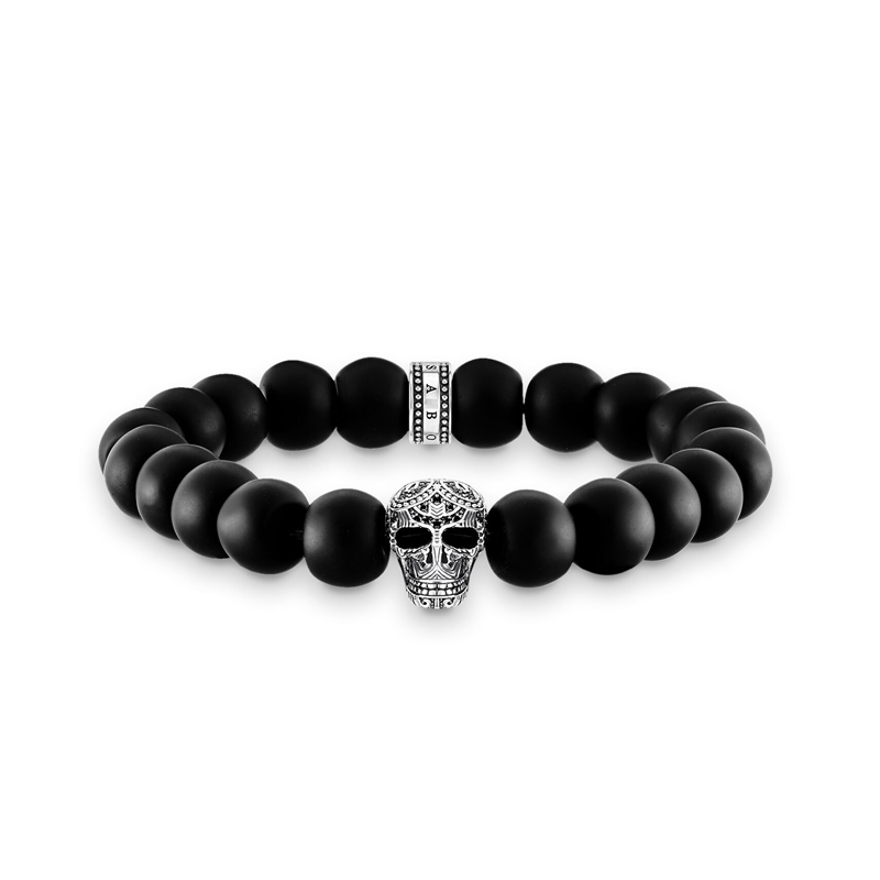 La pulsera "Calavera maorí" está hecha de plata 925 mm. y bolitas de obsidiana que miden 1,1 cm. de diámetro aprox.
