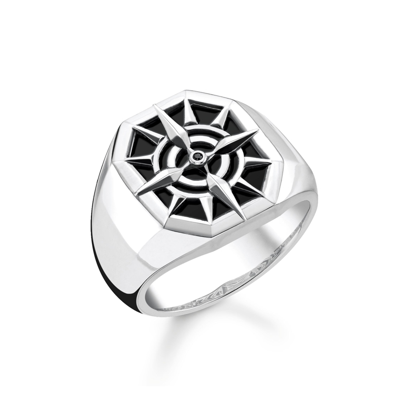 El anillo sello "Brújula" está hecho de plata 925 mm. y lleva un ónix central plano y con acabado pulido.