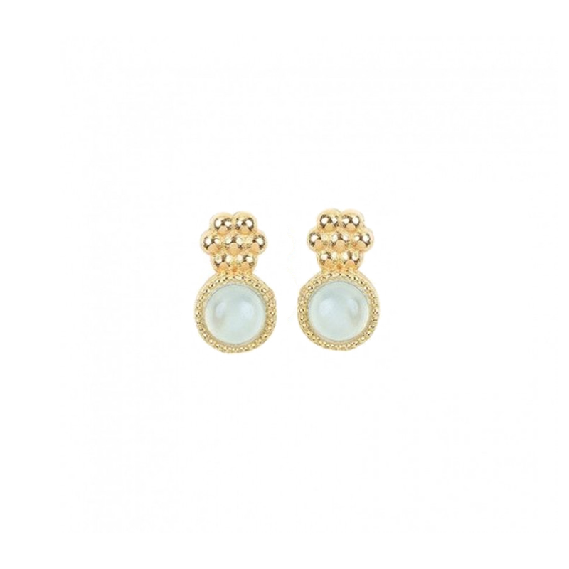 Realizados en oro amarillo de 18 quilates (750 mm.). Calcedonia de 3 mm. de diámetro. Sistema de cierre de rosca.